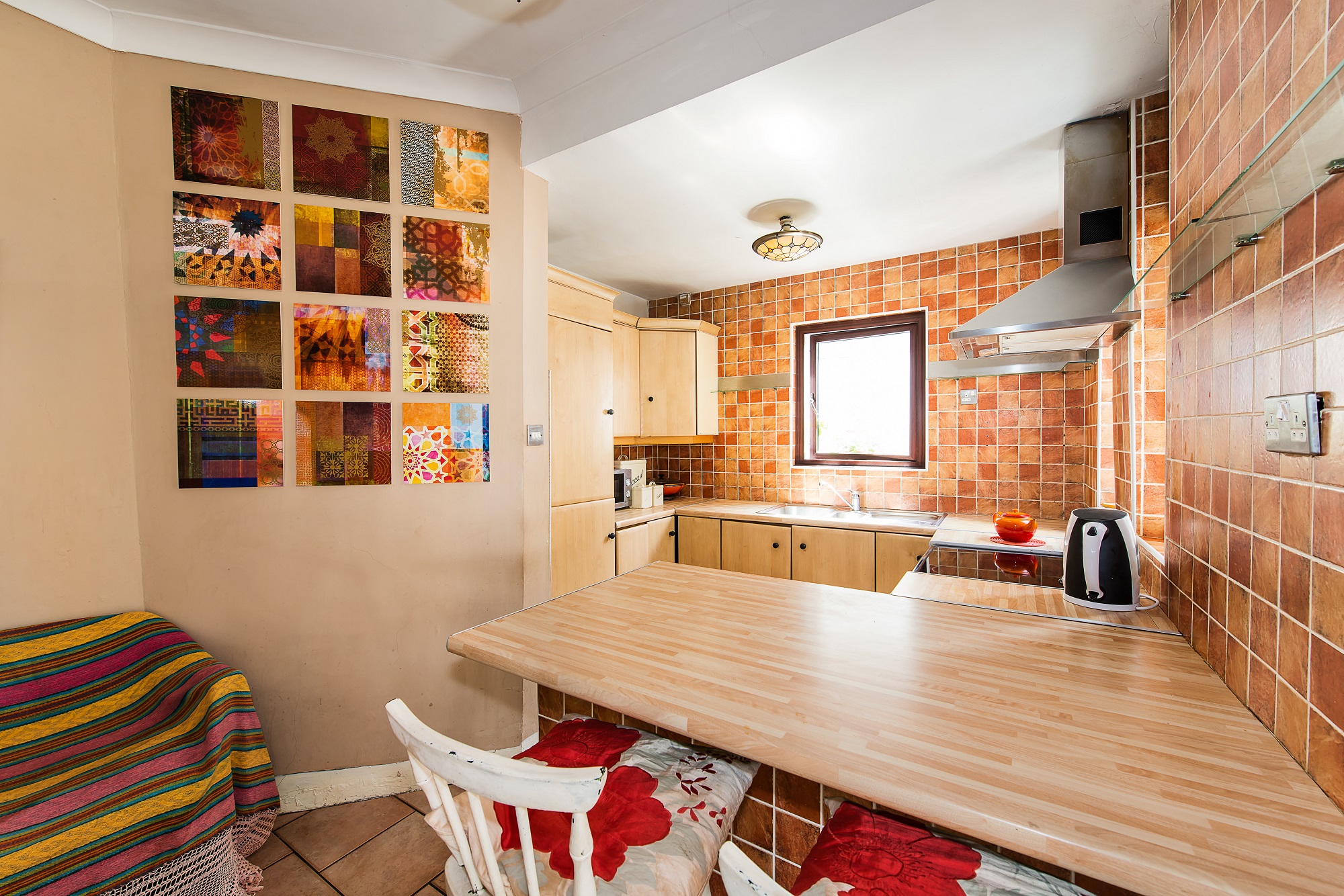 Maple shaker style kitchen presses with sink unit, complete floor tiling, complete splash back wall tiling. All kitchen appliances included to incorporate built in Candy fridge freezer, Beko electric hob & over cooker, Creda stainless steel extractor hood, coving, glass folding doors open into the conservatory area.